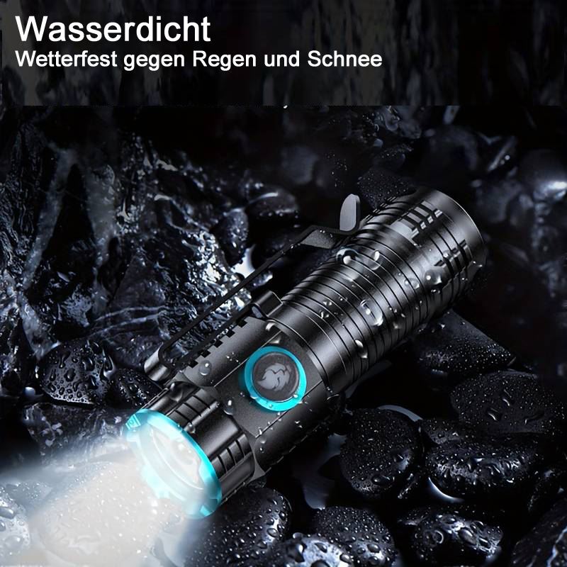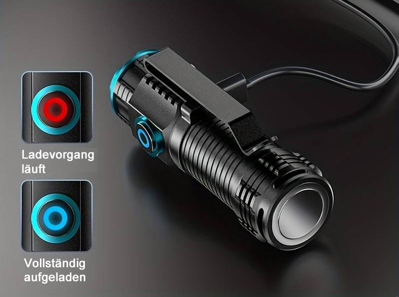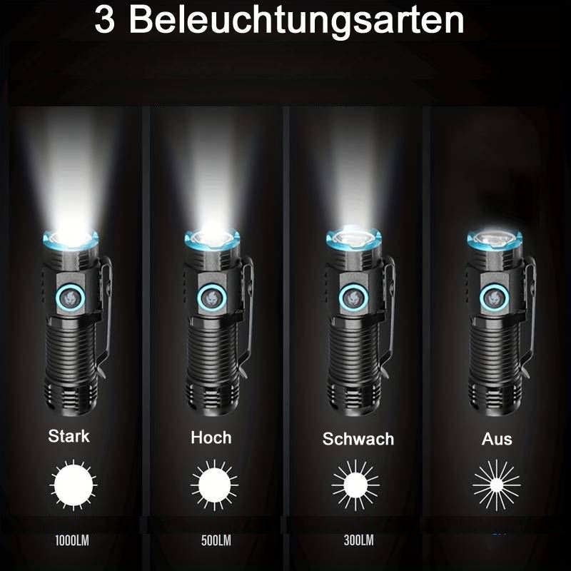 Leistungsstarke Backup Lampe, Wasserdicht und Staubdicht, USB-C Aufladekabel, 3 Lichtstärken, 1000 lm, 500 lm, 300 lm, ausgestattet mit einem Clip und starken Magnet, verfügt über eine Batteriekapazitätsanzeige.