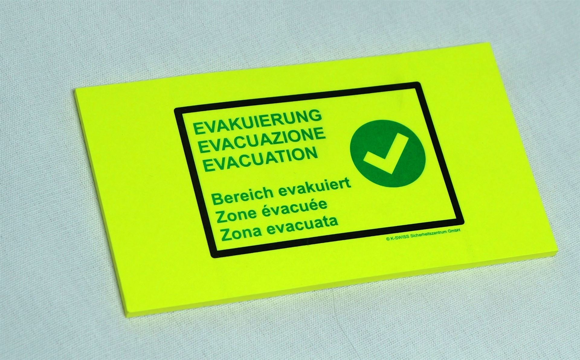Ein einzigartiger selbsthaftender Haftblock in allen drei Landessprachen (D/F/I), um bereits evakuierte Bereiche zu markieren.